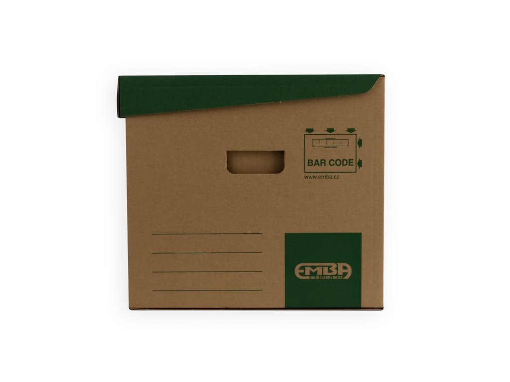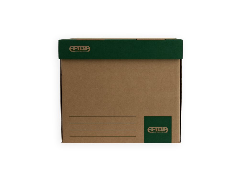 - je vyrobený z hnedej vlnitej lepenky so zelenou potlačou a je určený na uloženie 5ks zakladačov 8cm, alebo “Archive boxov” I/75 mm z hladkej lepenky, a voľne uložených spisov formátu A3.